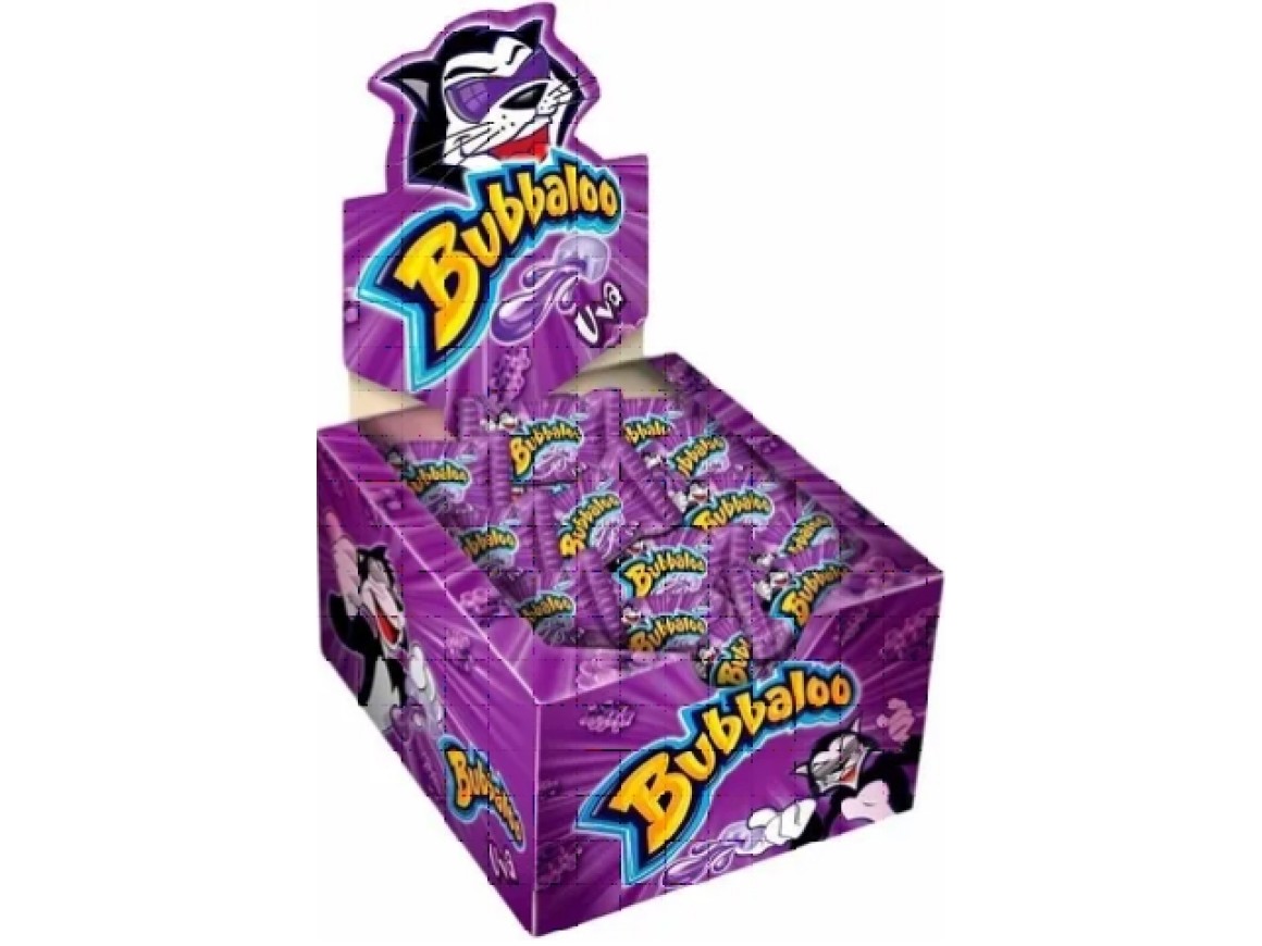 O famoso chiclete bubbaloo no sabor uva. Embalagem de 300g contendo aproximadamete 60 unidades.