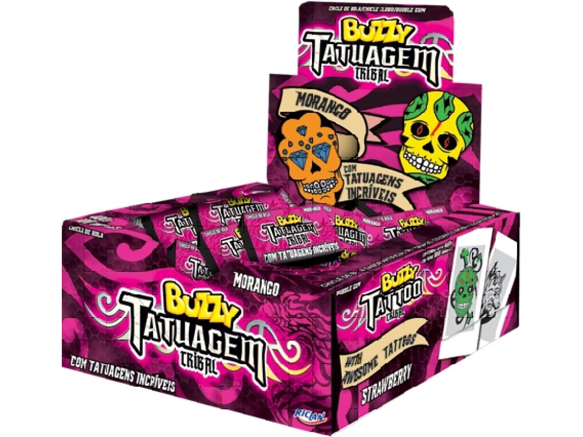 Chicle Buzzy no sabor morango com tatuagens iradas para você colecionar.